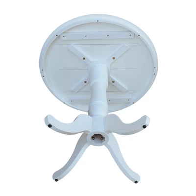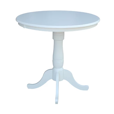 For those who appreciate high quality wood furniture with a traditional and elegant look. International Concepts home furnishings will complement any décor. This Table is made of solid wood ensuring years of use. The table features a butcher block top and a pedestal base with four feet for maximum support. It has a beautiful white finish. The round table top measures 36″ W x 36″ D, and is available in standard dining height, counter height, and bar height options. The standard dining height table is for use with dining chairs and is 28.9″ H. The counter height table is used with counter height stools and is 34.9″ H. The bar height table is 40.9″ H and is used with bar stools. This Solid Wood table ships ready to assemble.