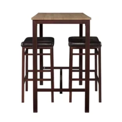 The Harrington 3pc Set Drop Leaf High Table with Counter Stools, Cushion Seat in Walnut & Black (24″) from Winsome adds architectural interest to your home through its unique lines. The all-wood table with rectangular top is held up by a series of triangular braces. The stools have a sleek, handsome design with button tufts. Table feature a drop leaf extension with a surface area of 39.37″W x 15.75″D. Table dimension when drop leaf is down is 39.37″W x 16.59″D x 36.22″H. Fully extended table size is 39.37″W x 31.50″D x 36.22″H. The set include 2 – 24″ Mona Counter Height Stools with PVC Faux Leather Cushion Round Seat with Wood frame
