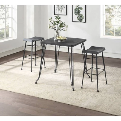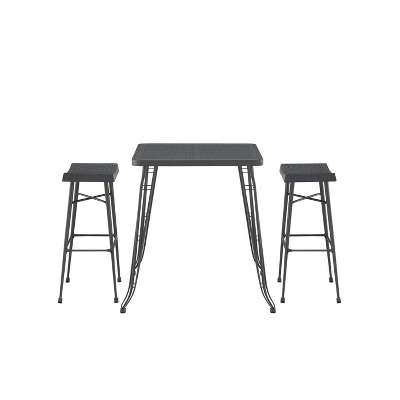 The Carson 3-Piece Pub Set immediately infuses your dining area with a dose of industrial cool. This 3-piece set is crafted entirely from steel with a gray finish. Perforated cutouts dot the stool seats and the tabletop, adding extra edge. The stool seats are molded for comfort and the built-in footrest adds stability and relaxation. Also available in 5-Piece Set. Ships ready to assemble with all hardware included.