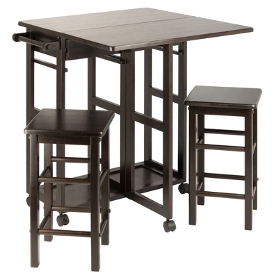 This inviting 3-Piece Space Saver Set will bring ease and versatility to dining in your kitchen, breakfast nook, or den. A drop leaf supported by a swing-away leg with a 5th rolling caster can be opened to create a dining table for two. Or lower the drop leaf, stow the stools, and roll the unit into the corner to create more open space. The sturdy hideaway stools have smooth, broad seat tops with rounded corners and can be tucked neatly under the table for a compact footprint. Two drawers with cut-out handles are ideal for silverware, napkins, and placemats. And the push handle also serves as handy place to hang a kitchen towel. Rolling casters, two of which lock to keep the unit stable while in use, allow for easily mobility. Made of solid and composite wood in a sleek Coffee finish.