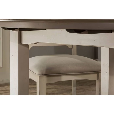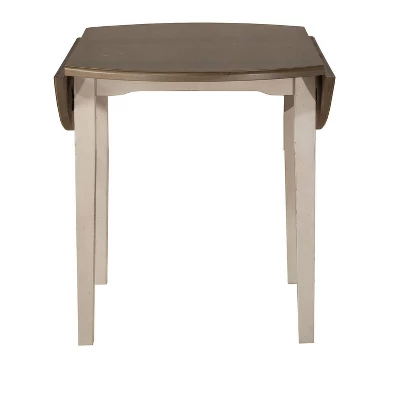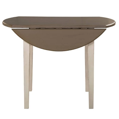 Delightfully charming. The Hillsdale Furniture Clarion Round 5-Piece Drop Leaf Dining Set with Side Chairs is the perfect complement to your cottage, coastal, contemporary, Hamptons, rustic, modern farmhouse, or transitional décor. With its straight lights, simple silhouette, Sea White wood finish, Distressed Gray table top, and Fog gray upholstery, this dining set has casual elegance. The included chairs feature a fashionable ship lap design. Compact and classy, the Hillsdale Furniture Clarion Round Drop Leaf Dining Set with Side Chairs is perfect for an eat-in kitchen or small dining room. Includes one drop leaf dining table and four chairs. Assembly required.
