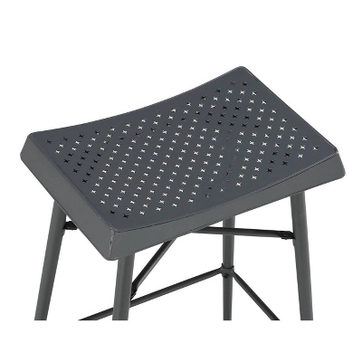 Full of industrial edge, the Gilbert 5-Piece Pub Set manages to maintain an air of coziness. This compact 5-piece pub set easily seats four people for dinner or drinks. Curved seats and built-in footrests provide comfort and stability for you and your guests. Crafted from 100% steel, the set is decorated with perforated stars dotting the seat and tabletop. Floor glides on the metal feet protect against damage to your floors. Also available in a 3-Piece Set. Ships ready to assemble with all hardware included.