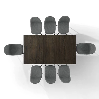 The Hayden 9pc Dining Set is sure to be a showstopper with its combination of farmhouse charm and sleek modern seating. Pairing a substantial wood table with upholstered faux leather chairs, this set delivers an upscale dining experience. The steel tapered legs of the chairs give an unobscured view of the table’s unique trestle base. Beautifully crafted to blend rustic and contemporary aesthetics, the Hayden dining set brings fashion and function to your evening meals. Overall Product Dimensions: 119”W X 87”D X 34”H