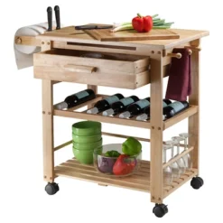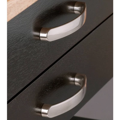 Add instant counter space and storage to your kitchen with the Bellini Kitchen Cart. And wheel the handsome, two-toned cart into the living room or the patio for entertaining. The double drop leaves provide extra surface space (up to 43″W) to prepare meals or serve hors-doevres. Plenty of room for ice, bottles of wine, glassware and serving plates. The cart features two drawers for kitchen or bar accessories, an open shelf, and a lower cabinet for additional storage. The drawers and cabinet are finished with quietly curved handles in satin nickel. The cart rolls easily on professional grade casters, two of which are locking to keep the unit stable while in use. Finished in a new, rich Coffee with a Natural wood top, the cart is made of Solid and Composite Wood for enduring good looks and integrity.