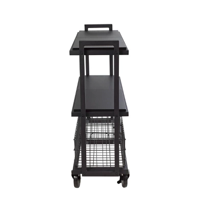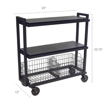 The Transformable 3-Tier Cart System provides efficient mobile storage for use in the kitchen, office or garage. Whether you are entertaining or just need extra storage, you can interchange shelves and baskets to suit your needs. The high quality, powder-coated steel frame is built for years of use. Four casters (two locking) allow for effortless movement. Contains 4 interchangeable premium laminated shelves and 2 sturdy wire baskets with liners. Each shelf allows for 12″ height and a weight capacity of 33 pounds per shelf.