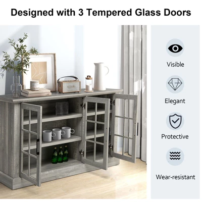 - Glass Doors with Metal Handles: Our storage buffet cabinet is designed with 3 tempered glass doors, which is visible, protective and wear-resistant. The 3 doors can keep items inside the cabinet clean. In addition, there are handles on the door to bring much more convenience.