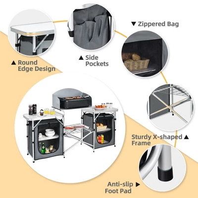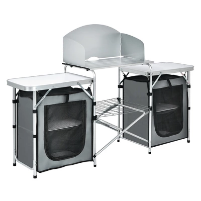 When it comes to the large storage space for outdoor cooking, our camping kitchen table will be the perfect choice for you!With 1 aluminum tabletop, 1 grid shelf, 2 side tabletops and 4 inner storage shelves, this outdoor camp table provides ample space to prepare food and store them. Moreover, the windscreen, zippered organizers with breathable mesh, round edge design and anti-slip foot pads endow great practicability and safety to this camp kitchen table. As an outdoor equipment, stability is important. Hence, this outdoor cook station features sturdy aluminum, steel and X-shaped structure. After using it, you can fold it quickly. Then put it on the carrying bag for portability.