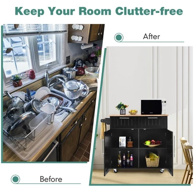 The organized kitchen trolley, which is stylish and versatile, features two utility drawers and double doors, simple but practical. The wood body and natural workmanship will coordinate well with many decorating schemes. And Large rubber wood top meetyour need of additional work surface. 4 universal steering casters(2 of them are lockable) provide easier mobility. It is perfect addition to anyone’s apartment or home and is ideal for adding extra counter space to your kitchen. Don’tHesitate To Buy It Now!