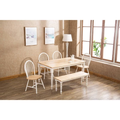 Classics, like the Boraam Farmhouse Table, never go out of style for a reason. Embodying the simplicity and cozy chic feel of farmhouse and cottage styles, this dining table brings warmth and elegance to your home. Its tropical hardwood construction features a two-toned natural and white finish. The natural wood top is polished to a high gloss to enhance the beauty of the rich wood grain. Clean-up is easy: just use a damp rag and some dish soap to wipe down the table in between meals. Gather loved ones around the table and enjoy your favorite meals together. This table can fit up to six guests – pair it with the matching Boraam Farmhouse Dining Chairs, which are sold separately.