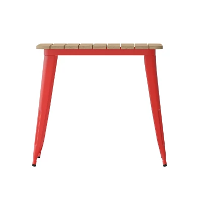 Instantly up your commercial or residential dining or lounge spaces with the upmarket look of this 31.5″ square indoor outdoor dining table. The slatted poly resin top paired with a steel frame lends a contemporary yet rustic look to any decor from industrial to farmhouse. Create a cozy spot to have drinks or dinner for 4 in your restaurant or pub or take the fun outdoors to your patio dining areas. Designed to stand up to the rigors of the hospitality industry, as well as busy households, this commercial table boasts a polystyrene top that will not rot, chip or peel and a 20 gauge steel frame that will hold up to 300 lbs. static weight capacity. Stainless steel hardware is rust resistant making this patio table ideal for year round use both indoors and out. Assembly takes less than 10 minutes with the included tools and cleanup is a snap with a damp cloth for quick seating turnaround. Adjustable floor glides ensure a stable, level surface and protect your indoor flooring from damage. Pair this table with other sizes or shapes in our collection for a cohesive look throughout your home or business.