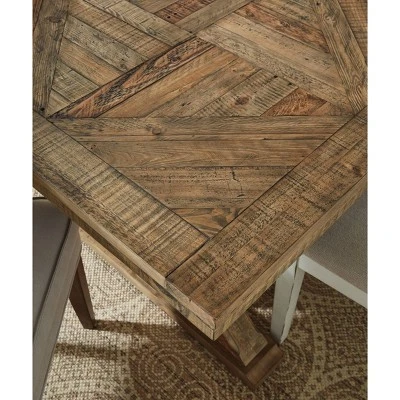 This rectangular dining table is a well-made country cottage inspired piece. Crafted with reclaimed pine wood, it pays homage to natural materials. Farmhouse trestle base is a substantial foundation. Natural finish grounds the space with earthy élan. With room for six people, plenty of farm to table dinners are in order. Dimensions: 76″W x 42″D x 30″H
