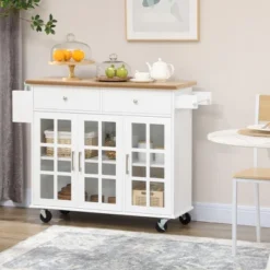 - Easy to Move Around: The rolling on-wheels design lets you quickly move your kitchen storage cart around your home. Two of the four wheels lock in place to help keep the kitchen island steady.