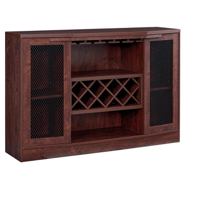 Combine elegance and practicality with this beautiful bar cabinet in an attractive espresso finish. It’s the perfect addition if you want to maximize space in your living or dining room without sacrificing sumptuous style. Features include two intricately designed curved glass doors that give this cabinet a classic bar look. There is ample storage space to showcase your finest glassware. The wine rack is an innovative feature in the center of the cabinet that allows you to showcase 7 of your favorite wines.
