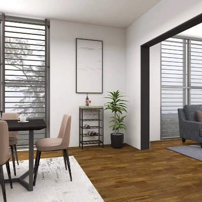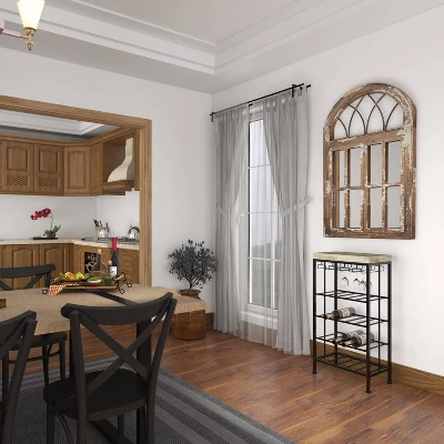 This contemporary-inspired wine storage provides you a perfect wine bottle and glass storage solution. It is designed with round stoppers at the base that prevent scratching and sliding. This item ships in 1 carton. Suitable for indoor use only. A wine storage with 4 metal shelves. Contemporary style. This metal and wood wine storage has a storage capacity of 15 bottles.