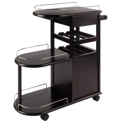 A unique piece reminiscent of the art deco style, the Jimmy Entertainment Cart from Winsome is also a functional piece of kitchen furniture. This wood kitchen cart with metal accents rolls along on wheels, so you can keep it pushed against a wall when not in use, or pull it out like an island to chop vegetables, assemble dishes or serve up mixed drinks. Underneath storage on this three-tier kitchen cart with drawers keeps unused items hidden away to minimize clutter and distraction.