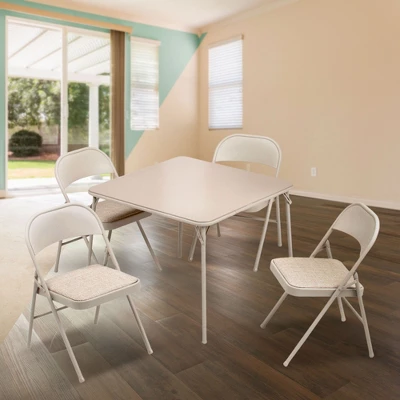 Set up for gatherings or games with this MECO Sudden Comfort 5-Piece Folding Furniture Set. This furniture set includes 1 table and 4 chairs, and is great for events and day-to-day use both indoors and outdoors. Gather your friends and family around this folding card table for game night, dinner, holidays, and more. When you need extra seating and table space, this set unfolds from its compact storage size to provide a comfortable seating solution. The foldable dining table measures 34 inches long and 34 inches wide, plenty big for 4 people. The folding chairs feature fully-contoured backrests and thick, high-density foam seat cushions. The padded vinyl surface on the table top is easy to clean and resists scratches and dents.Place and move these folding table and chairs anywhere. When it’s time to move, this fold-away table and chairs fold down to 1-inch for easy storage and transport. The durable steel frame sets up with EZ slide leg locks. With non-marring leg caps to protect hard floors, this metal folding table and chair set can go on any surface.Get ready for a card game, wedding, holiday celebration, or dinner with this MECO Sudden Comfort 5-Piece Folding Furniture Set.
