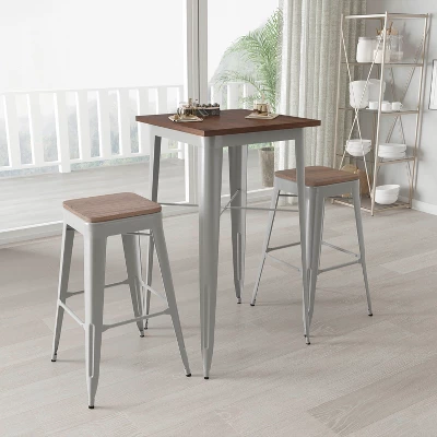 Smaller spaces require innovative design and this three piece bar height furniture set meets every requirement. Durably crafted with powder coated galvanized steel and topped with textured wood, this set is the best of modern design and rustic detailing. Both table and stools feature a cross braced design for added strength and reliable stability and floor glides to protect your footring surfaces from damage. The space saving backless stools stack for easy storage and can easily slide under the table when not in use to maintain an open feeling. Additional Features: Each Piece Fitted with Glides to Protect Flooring Surfaces, Item Size: Table: 23.5″W x 23.5″D x 42″H