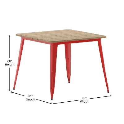 Refresh the look of your indoor or outdoor spaces with the stylish design of this 36″ square dining table with umbrella hole. Featuring a slatted poly resin top paired with a steel frame this contemporary yet rustic table will blend in almost any decor. Thoughtfully crafted with a poly resin top and a 20 gauge steel frame that will hold up to 300 lbs. static weight this patio table ideal for year round use. Pair with other items in the collection for a cohesive look throughout your home.
