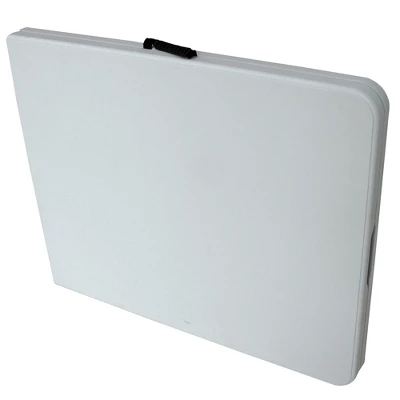 With this Plastic Development Group Banquet Table with included 4-pack of folding chairs, you can do it all. From catering and buffets to flea markets and garage sales, this sturdy yet lightweight table will display your treats and treasures. Use it for outdoor dining or entertainment, family reunions and parties, or as a work table in the basement or garage. This folding table measures 72 inches (6 feet) long, 30 inches wide, and stands 29 inches tall. You can fit 6 people comfortable around this fold-in-half table and the table itself holds up to 300 pounds. You can even add a tablecloth and some stylish chairs for a more sophisticated look. The durable resin tabletop is water-resistant and scratch-resistant. Rest assured this bi-fold table is secure because the sturdy steel legs lock in place. When not in use, the metal legs fold flat and the table folds in half for easy storage.