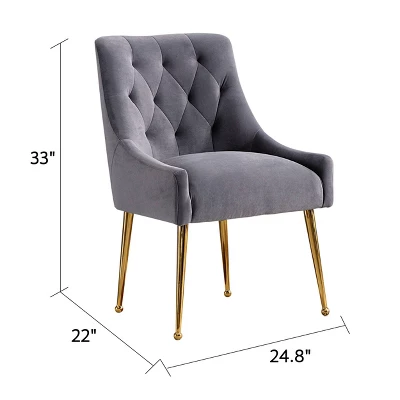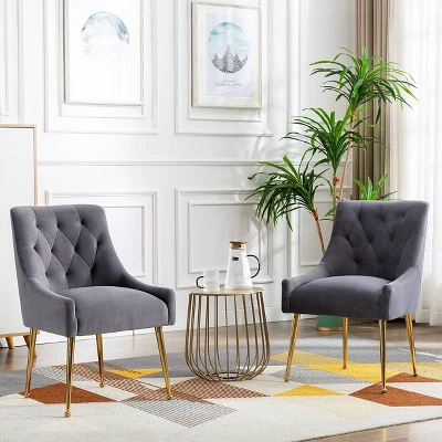 There are many beautiful design details on this dining chair (set of 2), The classic tufted design adds luxurious comfort to your dining experience. Whether your intention is to place it in your guest room for a splash of color and comfortable rest for weary visitors or to place it around the dining room table, this is a chair that exudes comfort and elegance. The slender polished golden metal legs bring modern design and add to the timeless fashion of this piece. Place 2-together to create a conversation area or pair with arm loveseat or sofa for a cohesive look.