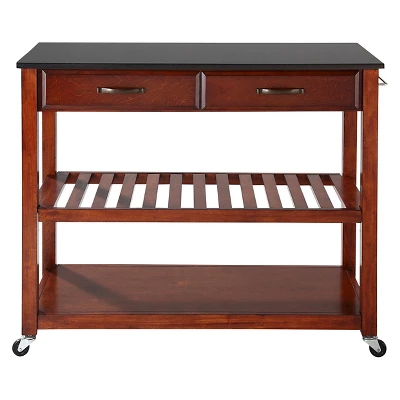 Create the culinary space of your dreams with a Solid Black Granite Top, Kitchen Cart/Island from Crosley. Constructed of solid hardwood with wood veneers and heavy-duty casters, this kitchen island is designed for longevity and portability. The gorgeous black granite top expands your serving and countertop space while the built-in drawers and adjustable shelf offer much-needed extra storage. Raised panel detailing clean, sleek lines provides the ultimate in style to dress up any space. Style, function, and quality make this portable kitchen island a versatile, must-have addition to your home.