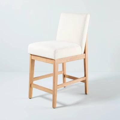 Add sophisticated appeal to your kitchen or bar counter with this Upholstered Natural Wood Slipper Counter Stool from Hearth & Hand™ with Magnolia. This counter stool is crafted from wood material for natural charm, while ultra-soft upholstery lends understated appeal to your space. This armless counter stool offers comfortable back and perfectly placed footrests to offer an inviting and comfortable spot for you to sit and relax. Pair this counter stool with matching pieces to create a cohesive look for casual entertaining.