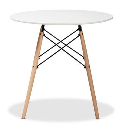Add a stunning centerpiece to your dining room with the Varen dining table. Made in China, this table is comprised of a sturdy wood and metal base fitted with a smooth white finished polypropylene plastic tabletop. Black finished metal crisscross support bars ensure excellent stability while lending a cool, industrial look that complements the oak brown finish on the wood. Requiring assembly, the Varen features a broad, circular tabletop that comfortably seats four. Perfect for both casual meals or dinners with friends and family, the Varen dining table elevates any occasion.
