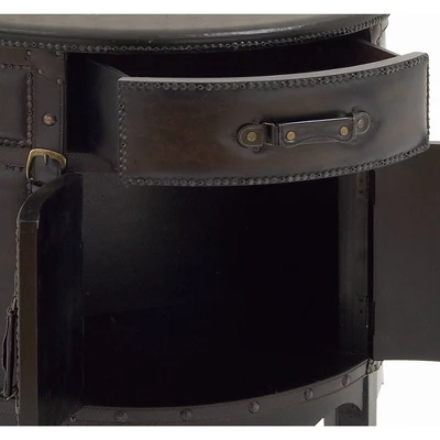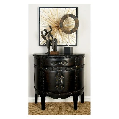 This dark brown traditional cabinet provides you a perfect storage solution and offers a clean and comfortable living space. A practical yet stylish upgrade that instantly elevate the look of your room. Maintain a clutter free zone and stay organize with this chic cabinet. An accent furniture with 1 cabinet measuring 27.12”L x 14”W x 12.25”H. This semicircle cabinet features 1 drawer with 14.75”L x 13.62”W x 4.50”H measurements and 20 lbs. weight capacity. Suitable for indoor use only. This faux leather cabinet can support up to 100 lbs. Traditional style.